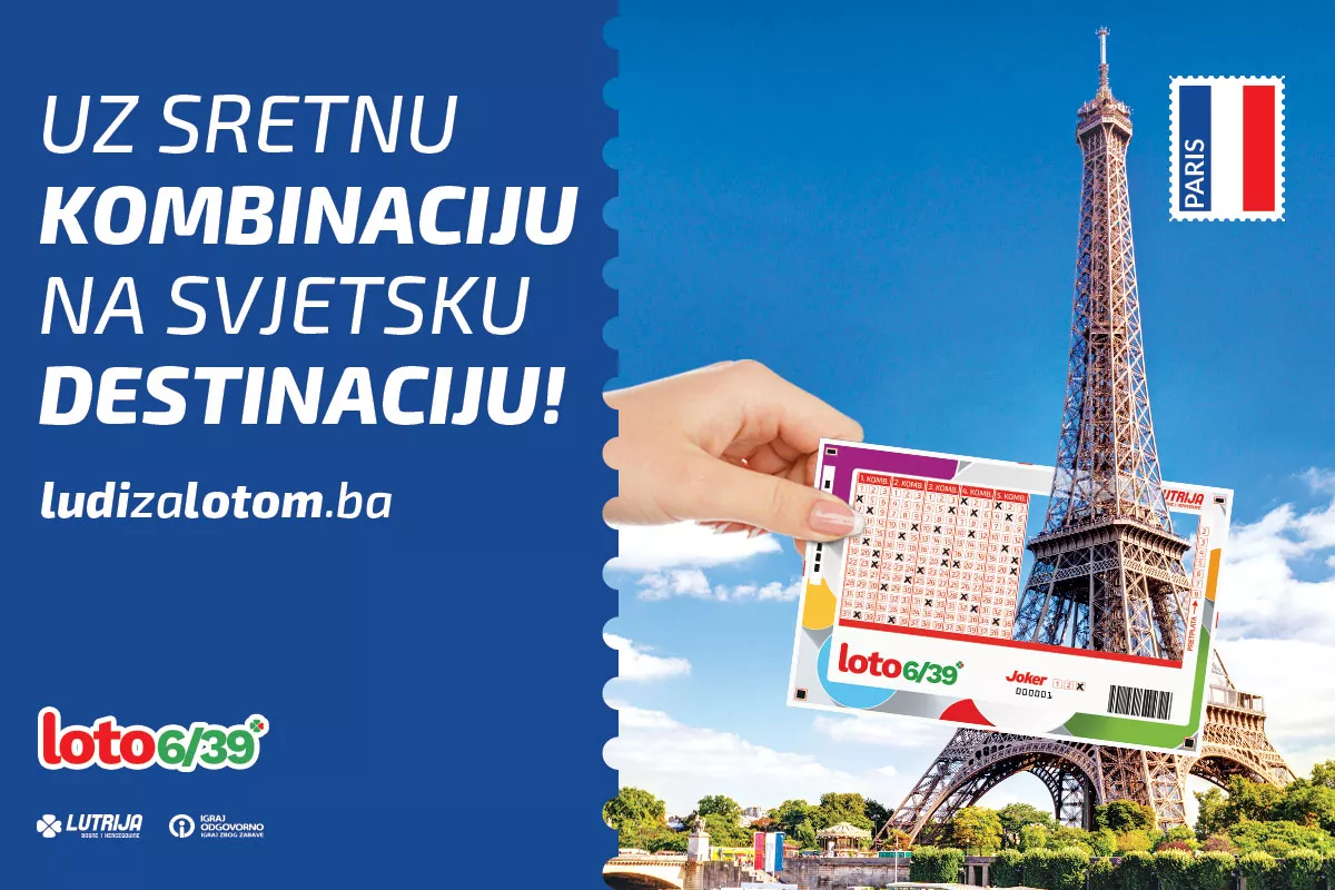 (Patria) - Iz Lutrije Bosne i Hercegovine dolaze sjajne vijesti za ljubitelje putovanja! Od sada u sklopu igre Loto 6/39 igrači će imati priliku, pored novčanih dobitaka, osvojiti i putovanje na neku od svjetskih turističkih destinacija! Izvlačenje dobitnika putovanja će se realizovati jednom mjesečno, a već narednog mjeseca, tačnije 13. juna, izvlači se prvi dobitnik putovanja. Destinacija u koju će sretni dobitnik otputovati je grad ljubavi – Pariz.