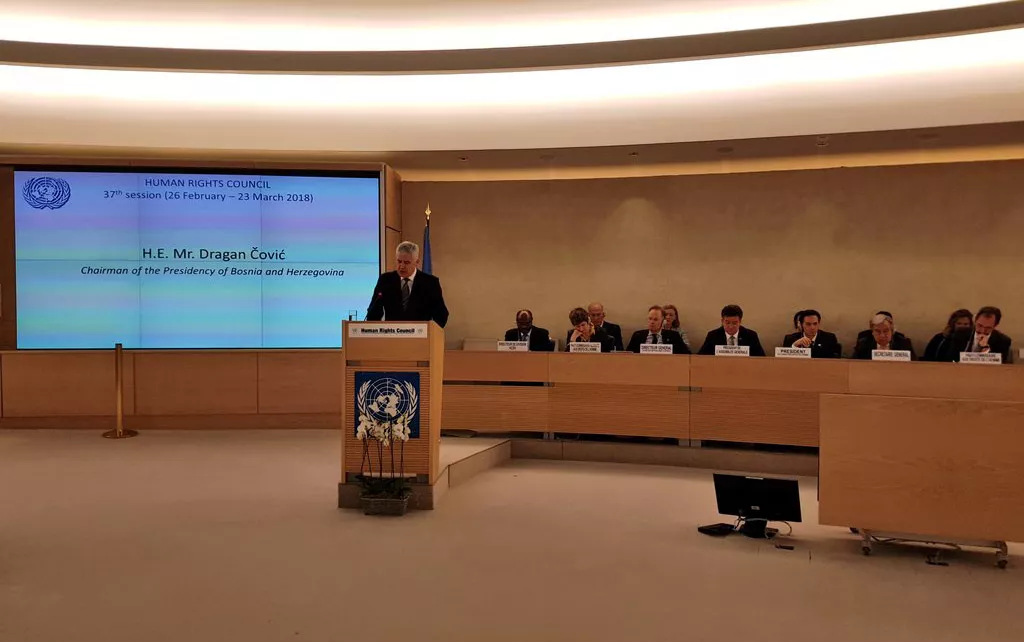 ŽENEVA, (Patria) - Predsjedavajući Predsjedništva Bosne i Hercegovine Dragan Čović obratio se danas na sesiji 37. zasjedanja Vijeća za ljudska prava UN u Ženevi.
