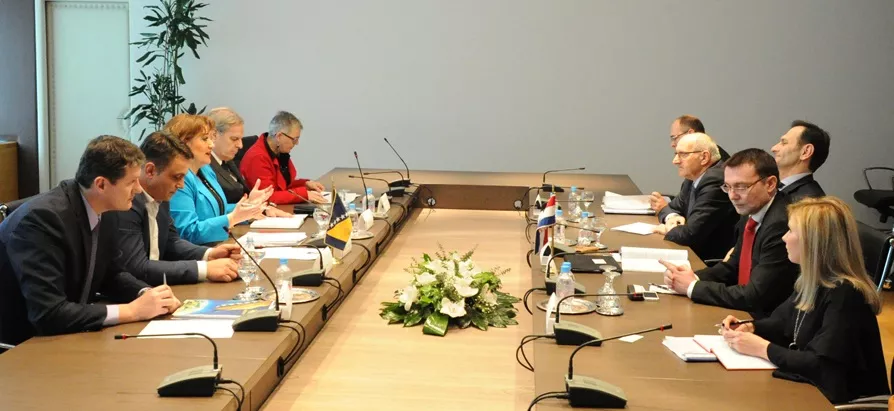 SARAJEVO, (Patria) - Predsjedavajuća Predstavničkog doma Parlamentarne skupštine Bosne i Hercegovine (PSBiH) Borjana Krišto, predsjedavajući Doma naroda PSBiH Ognjen Tadić i njihovi zamjenici Šefik Džaferović i Bariša Čolak razgovarali su danas sa članovima Delegacije odbora za vanjske poslove Hrvatskog sabora, koja na poziv Komisije za vanjske poslove Predstavničkog doma PSBiH boravi u dvodnevnoj posjeti BiH.