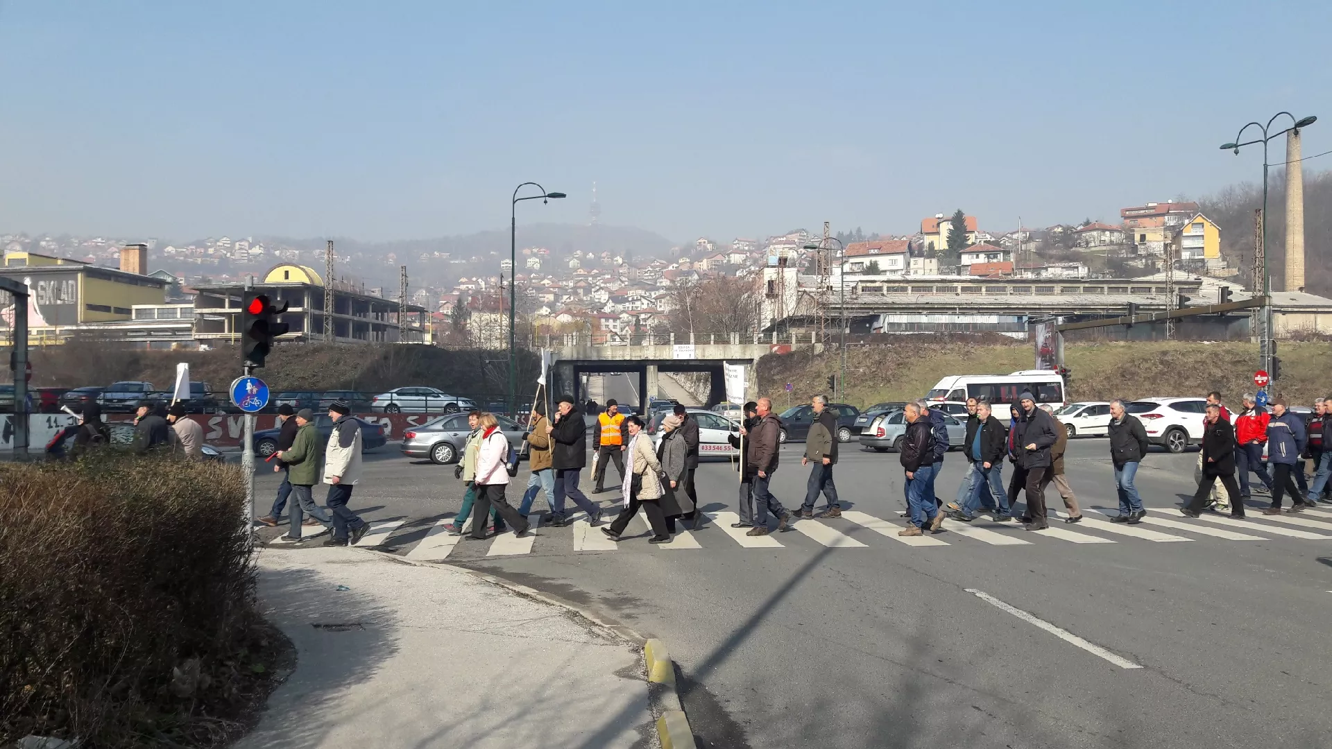 SARAJEVO, (Patria) - Grupa radnika "Hidrogradnje" protestuje ispred Energoinvesta u sarajevskom naselju Pofalići, gdje je odnedavno smješten ured premijera Federacije BiH Fadila Novalića, javlja agencija Patria.