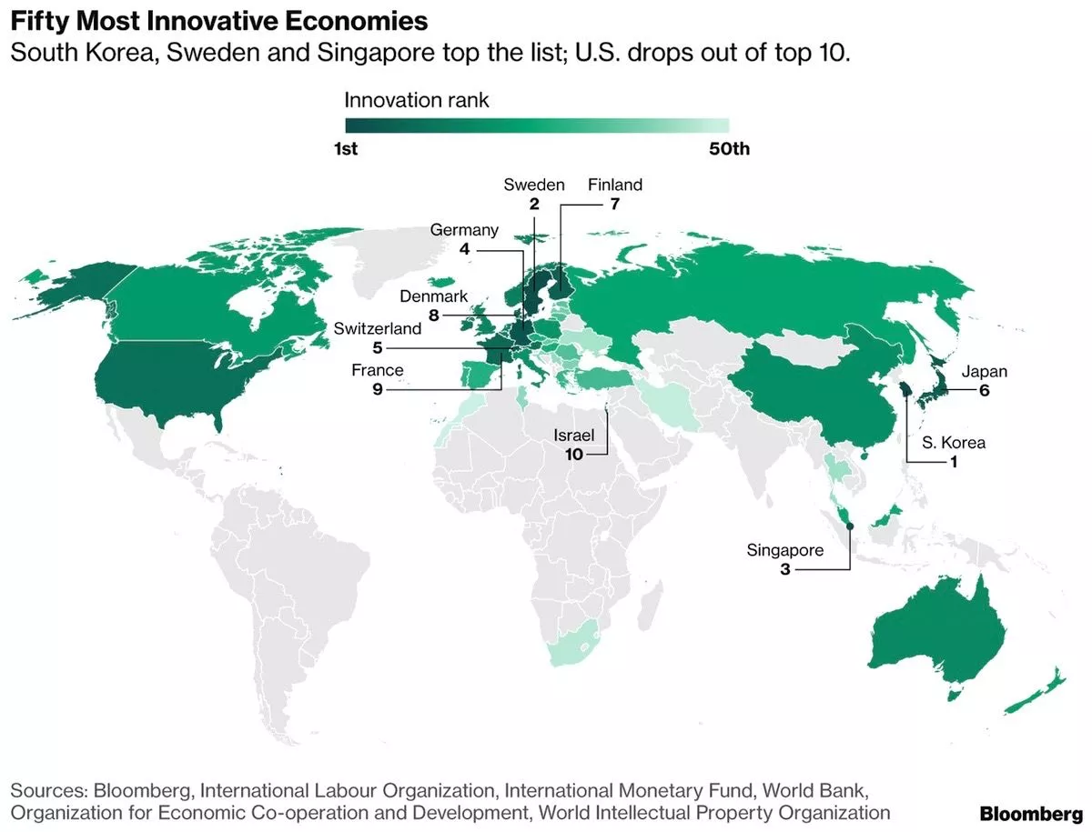Najinovativnija zemlja na svijetu je Južna Koreja, na drugom mjestu je Švedska, slijede Singapur, Njemačka, Švicarska, Japan, Finska, a listu deset najboljih zaključuju Danska, Francuska i Izrael.