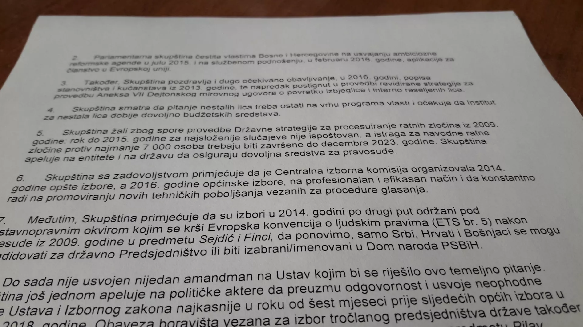 16. Skupština je veoma zabrinuta zbog sve većeg nepoštivanja vladavine prava u Bosni i Hercegovini i apeluje na nadležne vlasti da se povinuju odlukama Ustavnog suda i Suda BiH koje su konačne i obavezujuće. Skupština posebno žali zbog odluke Republike Srpske da ne provede odluku Suda BiH o uknjiižbi na državu vojne imovine koja se nalazi na njenom teritoriju, zbog odluke da se održi referendum o Danu Republike Srpske uprkos presudi Ustavnog suda u kojoj se on zabranjuje i zbog značajnog protraćenog vremena od strane državnog parlamenta vezano za provedbu odluke Ustavnog suda o Mostaru.