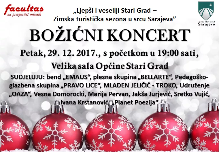 SARAJEVO, (Patria) - Udruga „Facultas za prosperitet mladeži“, u okviru projekta „Veseliji i ljepši Stari Grad – Zimska turistička sezona u Srcu Sarajeva, u petak, 29. 12. 2017. godine, s početkom u 19:00 sati, upriličit će Božićni koncert u Velikoj sali Općine Stari Grad.