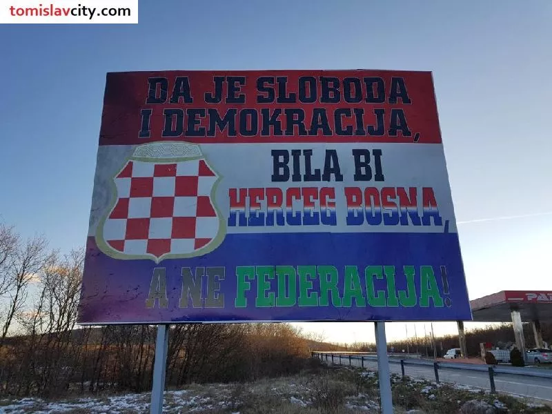 S jedne piše: "Dobro došli u Hrvatsku Republiku Herceg Bosnu“, dok s druge strane piše: „Da je sloboda i demokracija bila bi Herceg Bosna, a ne Federacija!“