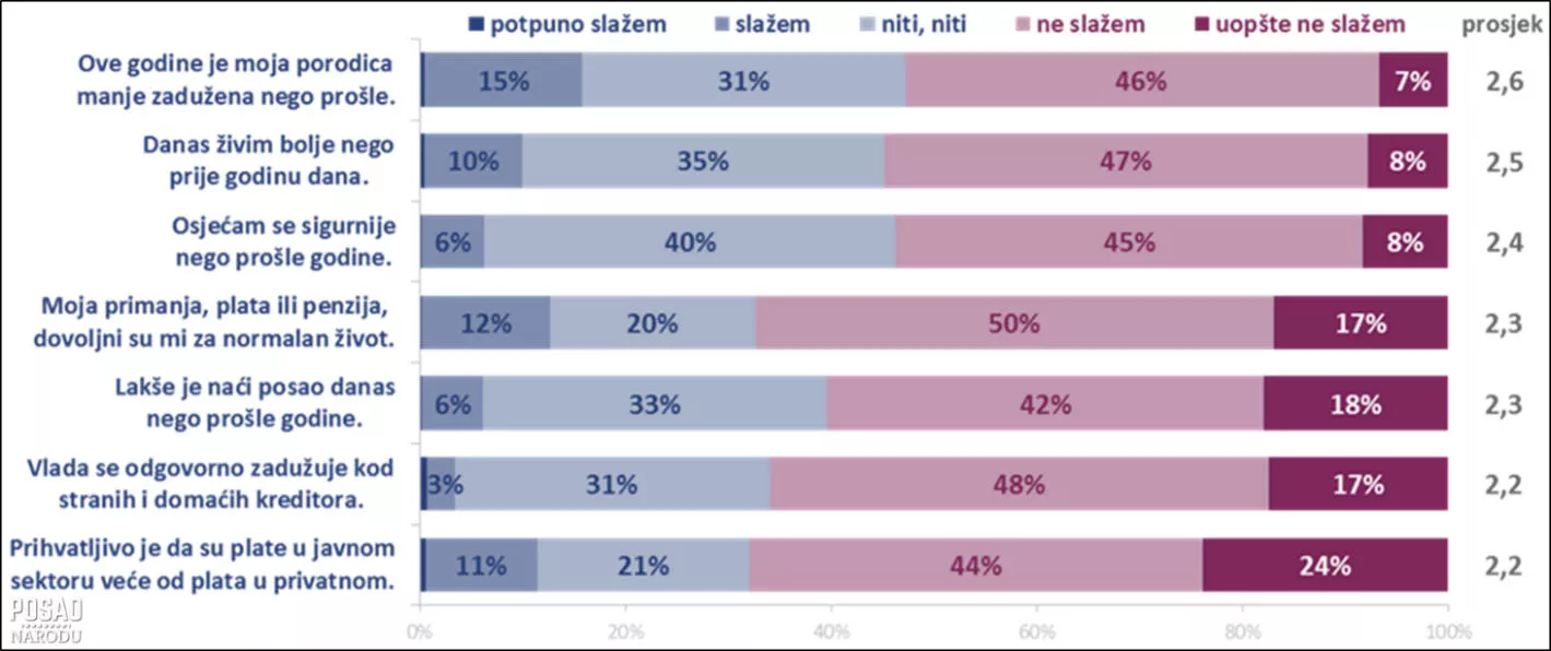 Na prvu tvrdnju „Ove godine je moja poprodica manje zadužena nego prošle“, polovina populacije BiH (53%) izjavila da je više zadužena nego prošle godine, dok su rijetki oni (16%) koji smatraju da su u ovoj godini manje zaduženi. Trećina (31%) je neodlučna, tj. nisu sigurni ni da li su više ili manje zaduženi nego prethodne godine.