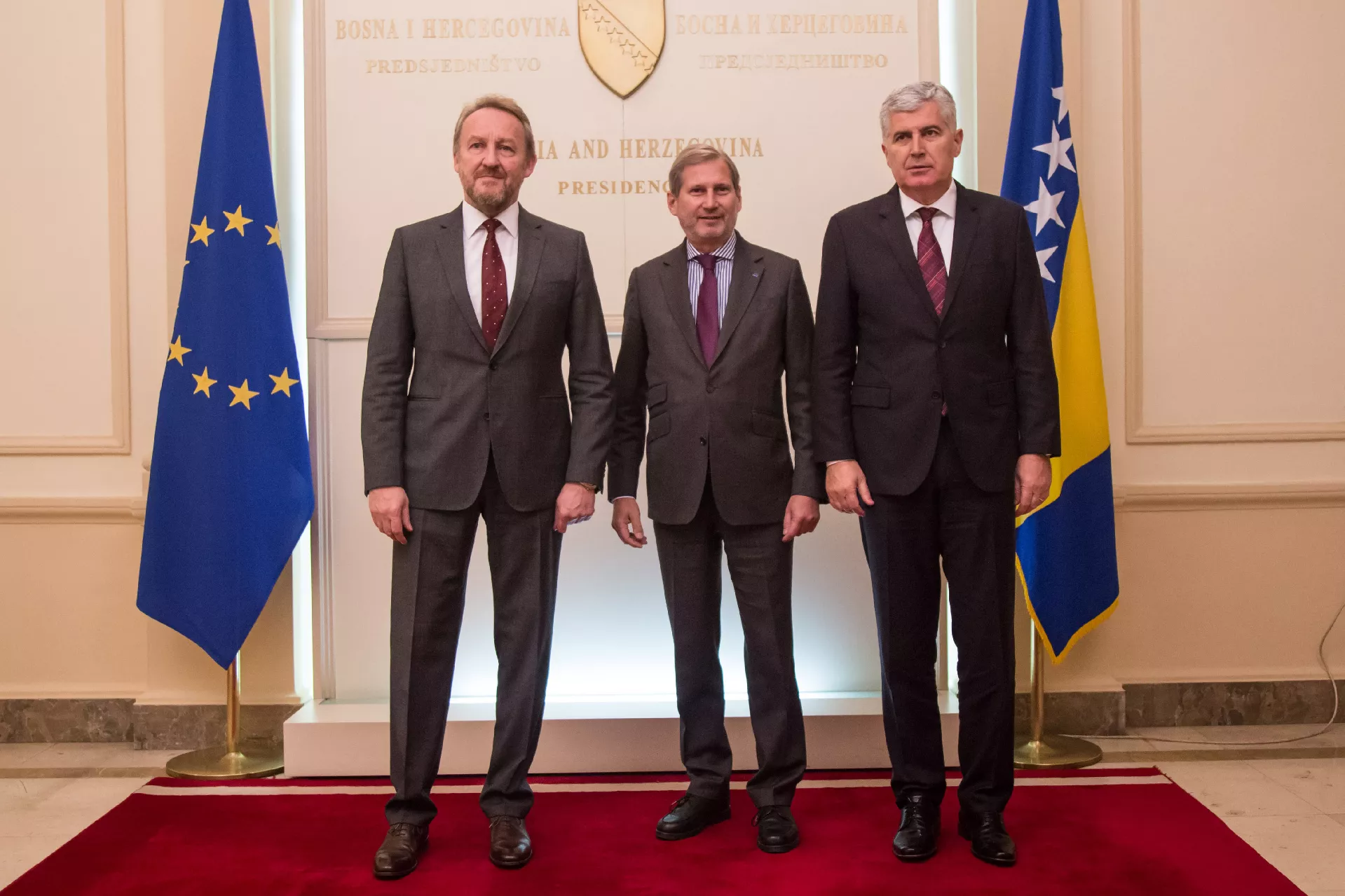 SARAJEVO, (Patria) - Predsjedavajući Predsjedništva BiH Dragan Čović i član Predsjedništva BiH Bakir Izetbegović primili komesara Evropske unije za politiku susjedstva i pregovore o proširenju Johannesa Hahna