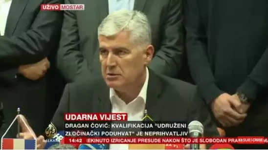 MOSTAR, (Patria) - Dragan Čović, predsjednik HDZ BiH i član Predsjedništva BiH obratio se danas iz Centrale ove stranke u Mostaru gdje je sa užim rukovodstvom stranke, ali i predstavnicima drugih stranaka pratio izricanje presude Jadranku Prliću, Slobodanu Praljku, Berislavu Pušiću, Valentinu Ćoriću, Milivoju Petkoviću i Bruni Stojiću čelnicima HRHB za ratne zločine. No, nakon što je potvrđena zatvorska kazna Prliću, Stojiću, Praljku, došlo je do prekida izricanja presude. Slobodan Praljak popio je tekućinu iz bočice za koju je tvrdio da je otrov. Prema informacijama Praljak je preminuo u bolnici.