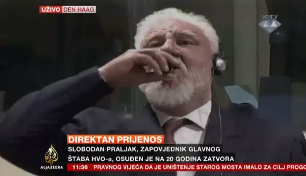 Praljak je uzeo bočicu i ispio neku tekućinu iz nje. Iako je prijenos bio nastavljen, ubrzo je prekinut jer se u sudnici čulo da je Praljak popio otrov. Zastori na sudnici su spušteni.