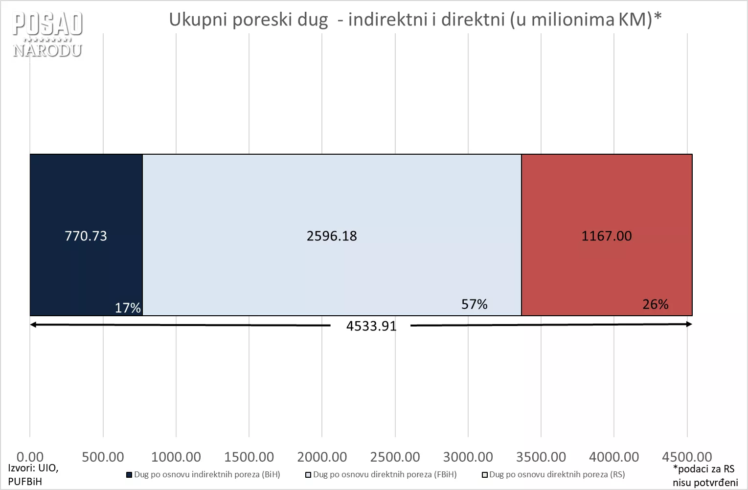 Iz CCI-a podsjećaju da iako zvanična statistika u 2017. godini bilježi rast prikupljenih direktnih i indirektnih poreza, ukupni poreski dug u BiH (po osnovu direktnih i indirektnih poreza) iznosi nevjerovatnih 4,5 milijardi KM! Pri tome, navode iz te organizacije, samo za direktne poreze (poraz na platu, doprinosi za PIO, zdravstveno osiguranje, nezaposelnost, itd) dug iznosi oko 3,8 milijardi KM. Poređenja radi, ukupni poreski dug je skoro 4 puta veći od posljednjeg višegodišnjeg aranžmana s MMF-om.