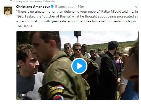 Poznata novinarka CNN-a Kristijan Amanpur (Christiane Amanpour) na svom Twitter nalogu objavila je sjećanje na 1993. godinu kada se susrela sa zločincem Ratkom Mladićem.