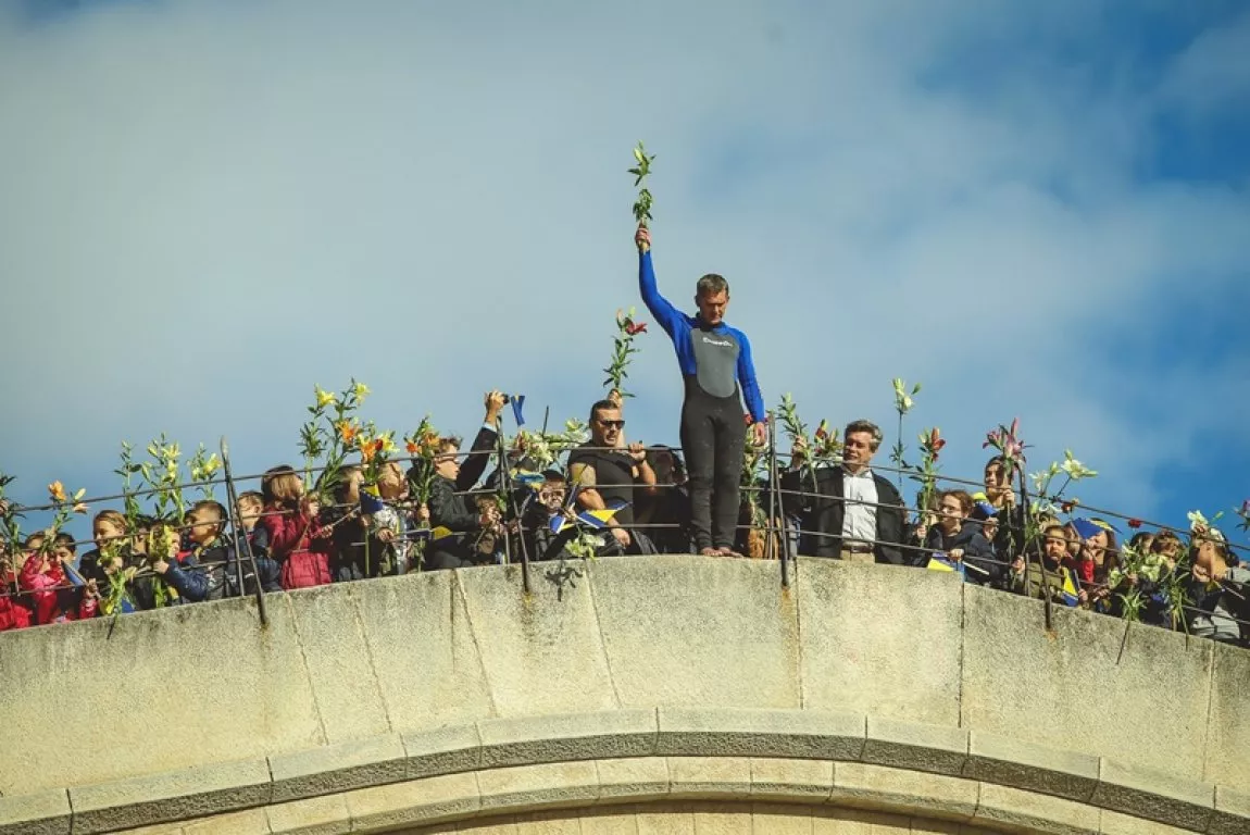 Uz prisustvo velikog broja građana i zvanica, te učenika iz nekoliko mostarskih osnovnih škola koje nastavu izvode na bosanskom jeziku, ceremonija je počela tačno u 10 sati i 16 minuta - u znak sjećanja na trenutke kada je 1993. godine most konačno pao u Neretvu - zvucima sirene za opću opasnost i bacanjem cvijeća u Neretvu, te skokom bez aplauza, kojeg je izveo dugogodišnji član Kluba "Mostari", skakač Semir Kazazić.