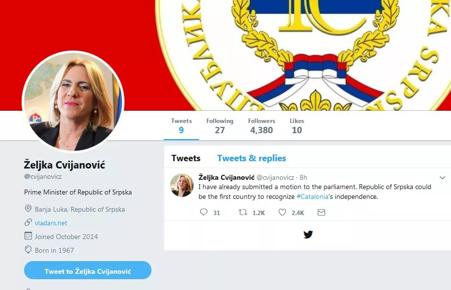 Podsjetimo, na Twitteru je tokom dana objavljen status pod navodnim imenom Željke Cvijanović u kome u prevodu na bosanski jezik piše: "Već sam podnijela prijedlog parlamentu.Republika Srpska bi mogla biti prva država koja priznaje nezavisnost Katalonije".