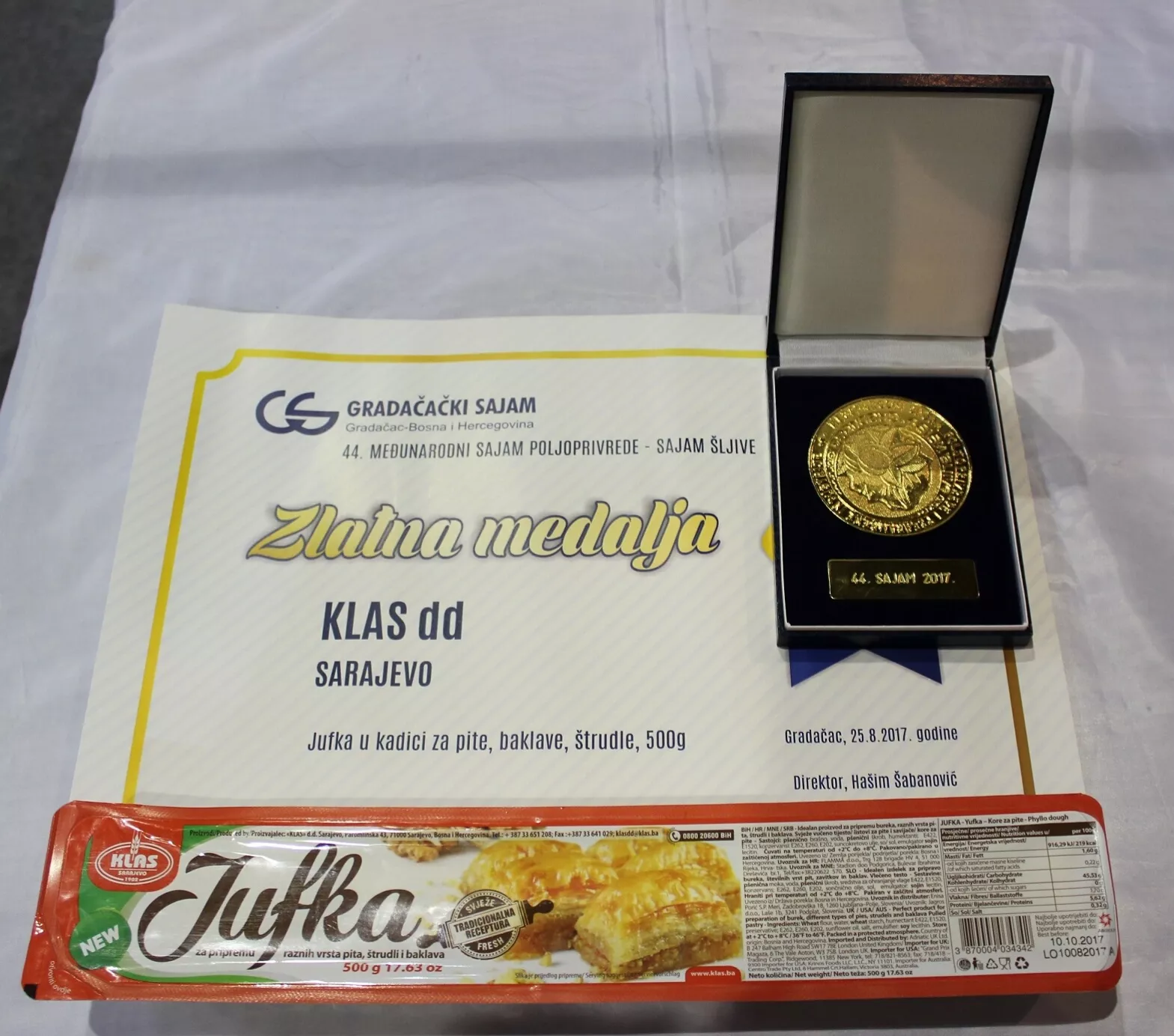 Jufka u posudi prehrambene industrije Klas d.d. Sarajevo nagrađena je Zlatnom medaljom za kvalitet na Međunarodnom sajmu poljoprivrede i prehrambene industrije koji se održava u Gradačcu, piše agencija Patria.