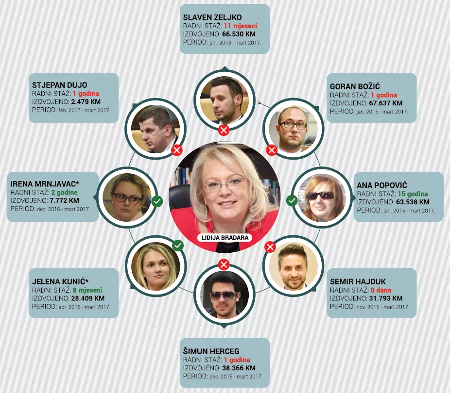 Bradara je dvije svoje savjetnice imenovala dok je na snazi bio izmijenjeni Zakon o državnoj službi FBiH – Jelenu Kunić i Irenu Mrnjavac i na njih se nije odnosilo pravilo o petogodišnjem radnom iskustvu.