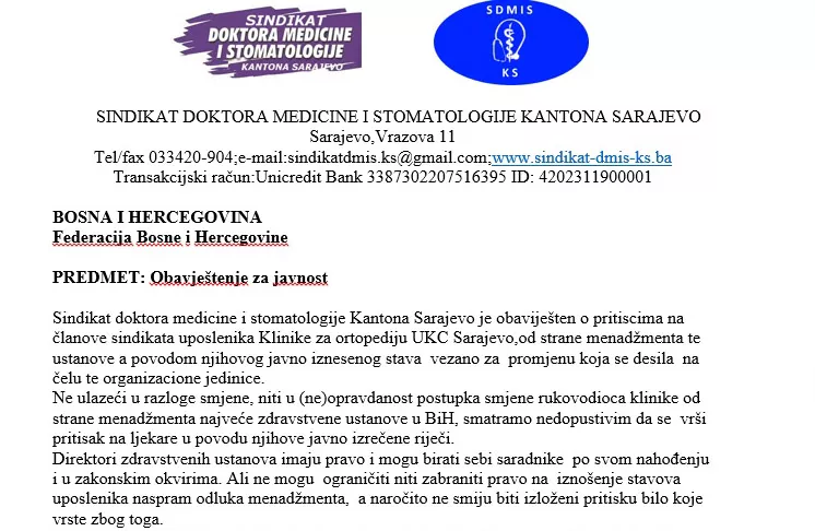 Sindikat doktora medicine i stomatologije Kantona Sarajevo je obaviješten o pritiscima na članove sindikata uposlenika Klinike za ortopediju UKC Sarajevo, od strane menadžmenta te ustanove a povodom njihovog javno iznesenog stava vezano za promjenu koja se desila na čelu te organizacione jedinice, navodi se u reakciji Sindikata, prenosi agencija Patria.