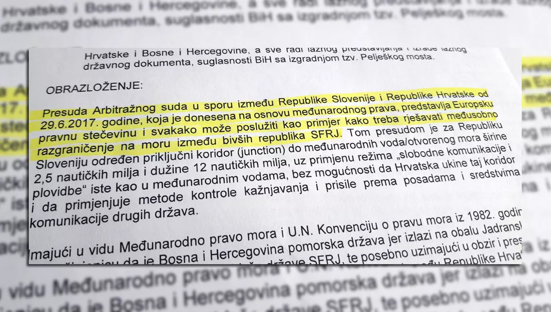 „Republika Hrvatska prema Bosni i Hercegovini vodi nekorektnu politiku: s jedne strane se ponaša agresivno jer krši U.N. Konvenciju o pravu mora i nedozvoljeno odsijeca našu državu od međunarodnih voda i nasilno nameće izgradnju tzv. Pelješkog mosta, čime fizički blokira jedinu usku pomorsku vezu naše države sa međunarodnim vodama i sa ostalim državama svijeta, te na taj način ugrožava mir, suverenitet i stabilnost Bosne i Hercegovine kao pomorske države, a sa druge strane Republika Hrvatska obmanjuje međunarodnu javnost da povezuje svoje hrvatske obale preko svojih hrvatskih unutarnjih voda i da tako provodi Evropsku kohezijsku politiku i da povezuje evropski prostor radi ulaska u EU zonu Schengen, pa iz navedenih razloga mi smatramo da ovakvo agresivno ponašanje Republike Hrvatske predstavlja grubo narušavanje geopolitičkog poretka na Jadranskom moru i na jugoistoku europskog kontinenta“, navodi se u pismu, koje je u posjedu agencije Patria.