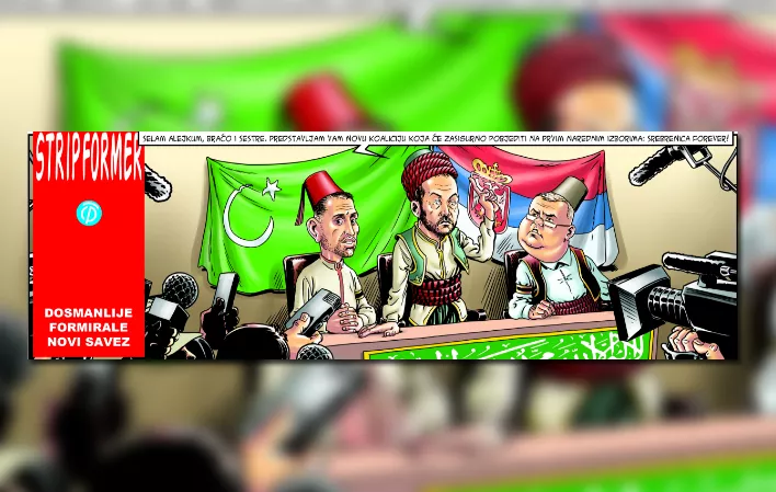“Selam alejkum braćo i sestre. Predstavljam vam novu koaliciju koja će zasigurno pobijediti na prvim narednim izborima: Srebrenica Forever!”, riječi su koje na karikaturi govori lider Pokreta slobodnih građana Saša Janković
