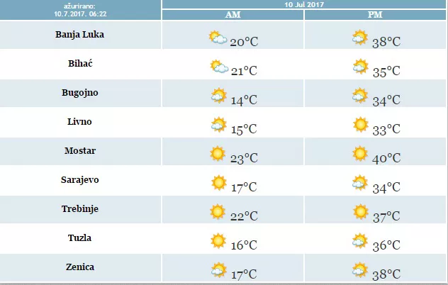 Prema prognozi Nedima Sladića danas će se temperature kretati od 35 do 41 stepen Celzija, na neretvanskom i zeničkom području lokalno do 42°C.