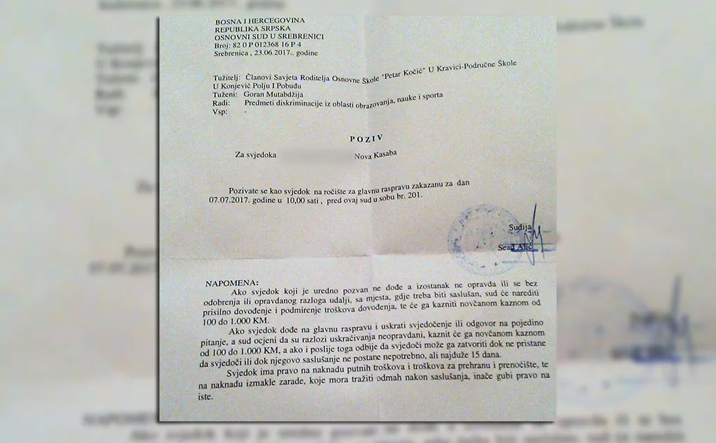 Osnovni sud u Srebrenici uputio je pozive roditeljima u slučaju tužbe protiv bivšeg ministra obrazovanja u bh. entitetu Republika Srpska Gorana Mutabdžije, kojeg roditelji iz Konjević-Polja kod Srebrenice smatraju odgovornim jer njihovoj djeci nije omogućio izučavanje nacionalne grupe predmeta, iako im je to Ustavom zagarantovano pravo.