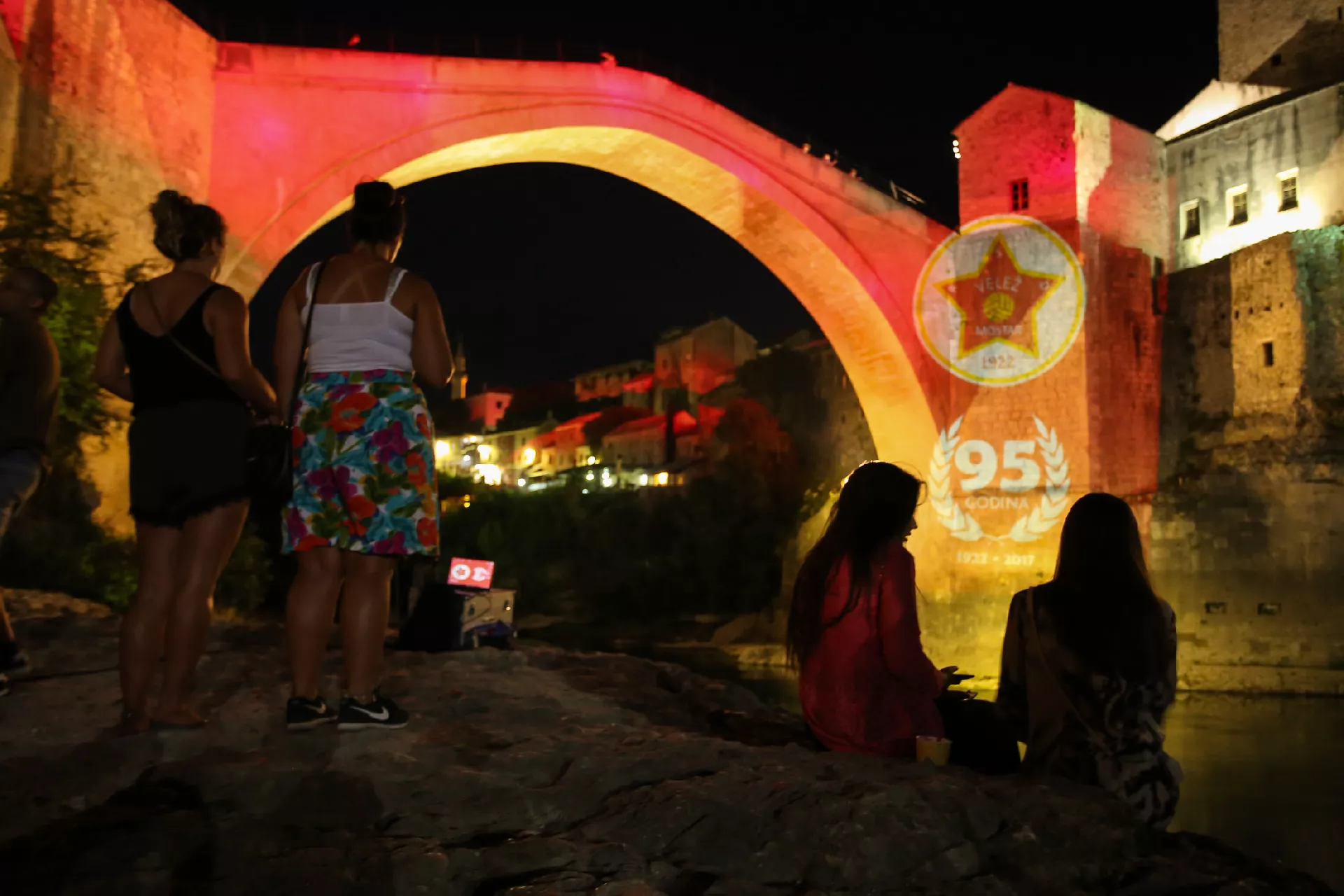 Stari most osvijetljen je crvenom Veležovom bojom uz istaknuti grb ovog slavnog mostarskog kluba, broj godina njegovog postojanja, veličajući tako nesvakidašnji prizor u UNESCO-voj zaštićenoj zoni stare gradske jezgre