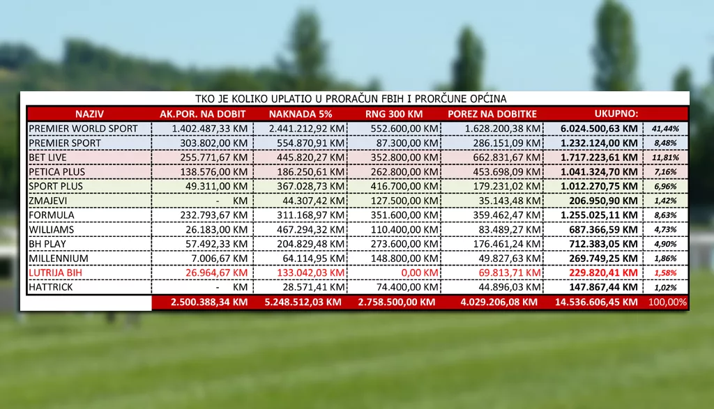 Najviše od toga iznosa uplatila je PREMIER kladionica, kroz svoje dvije firme, Premier World Sport i Premier Sport, i to ukupno 7,2 miliona KM. Ova firma iz Čitluka, dakle, sama je uplatila 49,92 posto ili jednako kao i svi ostali priređivači igara u FBiH zajedno.