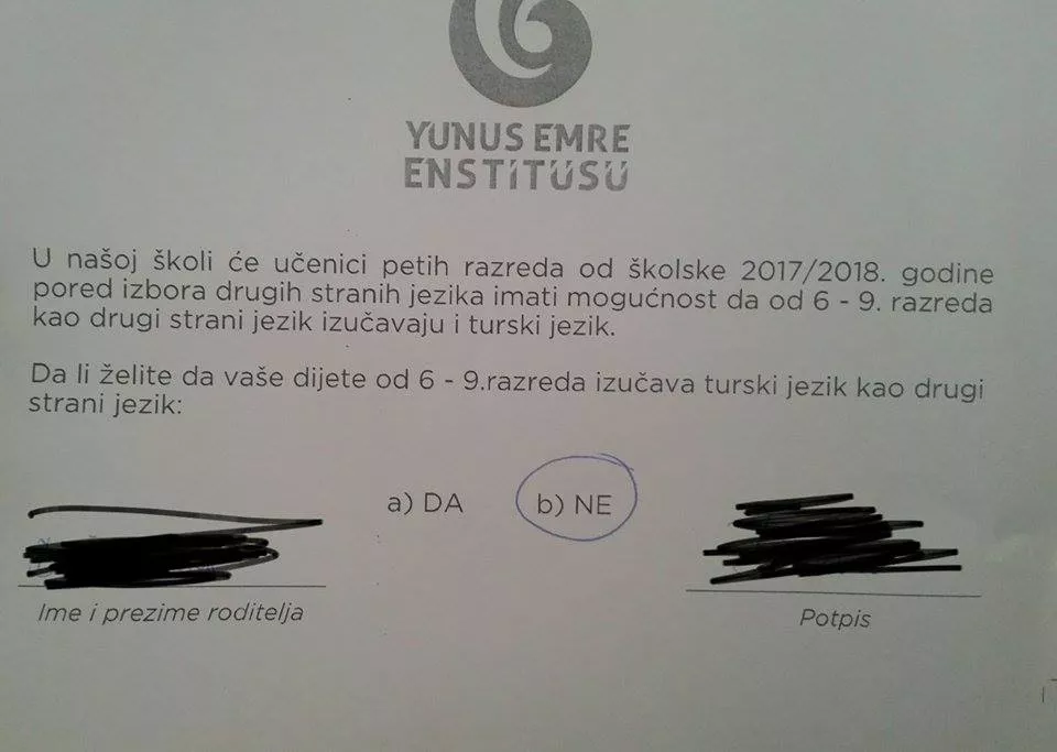 Naime, posljednjih dana djeca donose kući anketni listić koji su dobili na prezentaciji koje u školama obavljaju iz Junuz Emre instituta, i to opet bez znanja roditelja, te im se nudi da izučavaju turski jezik, kao drugi strani.