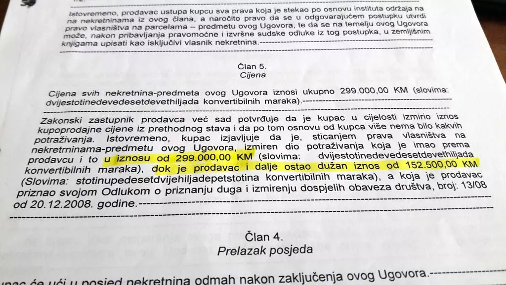 U dijelu ugovora u kojem se spominje cijena od 299.000 KM stoji i to da se plaćanje izvrši prebijanjem dugova.