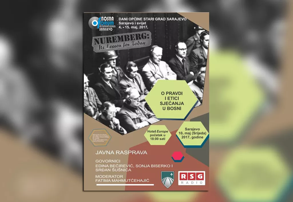 U okviru Dana sarajevske općine Stari grad večeras će se u Hotelu Evropa održati javna rasprava 'O pravdi i etici sjećanja u Bosni', na kojoj će govoriti Srđan Šušnica, Sonja Biserko i Edina Bećirević, uz prikazivanje filma 'Nuremberg - Its Lesson for Today', piše Patria.