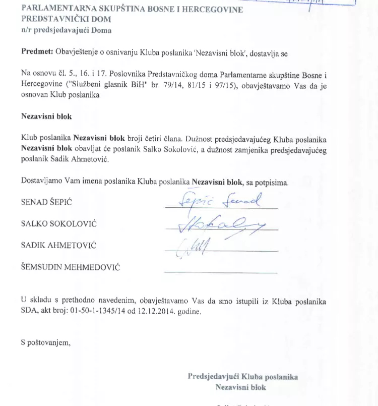 Kako se navodi u zahtjevu predsjedavajući Kluba poslanika bit će Salko Sokolović dok će zamjenik biti Sadik Ahmetović.