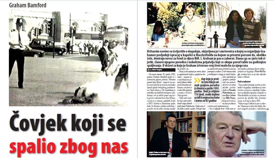 "Na ovom mjestu 29. aprila 1993. godine Graham Bamford spalio se i umirućim glasom poručio: Moramo pomoći djeci Bosne!" – natpis je na maloj crnoj ploči koja stoji na travnjaku ispred zgrade britanskog parlamenta.