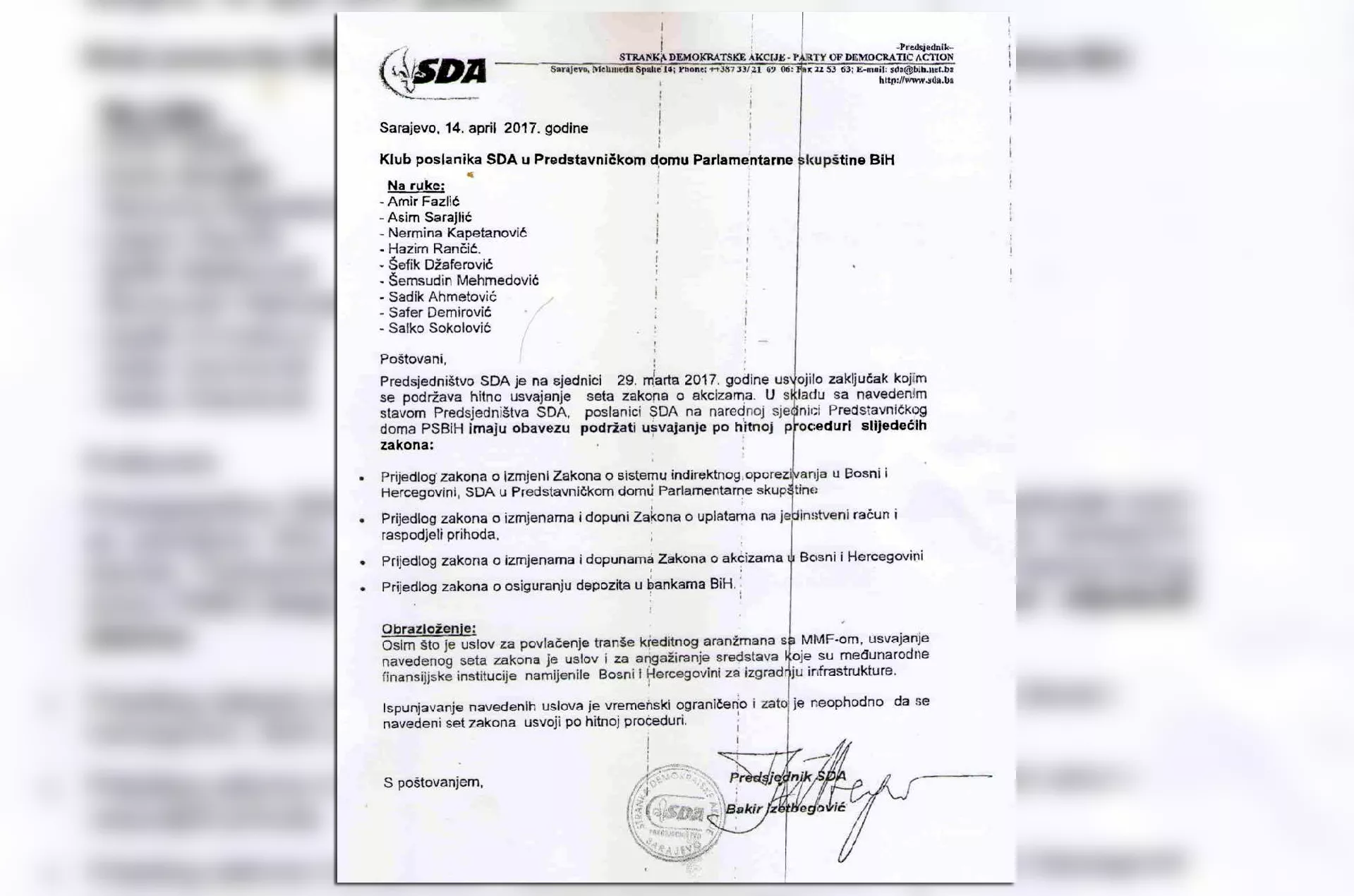 Kako otkriva naš izvor iz SDA sada je već jasno da će Mehmedović glasati za povećanje akciza, a nakon što je zatražio da se prihvati niz zaključaka. Takvi zaključću mogli su se čuti i na sjednici kada su odbačeni zakoni (Mehmedović se nije uključivao u raspravu), pa bliski saradnici Mehmedovića kažu da je ovo samo njegov izgovor da bi mogao glasati za, a kako nalaže i sam Izetbegović.