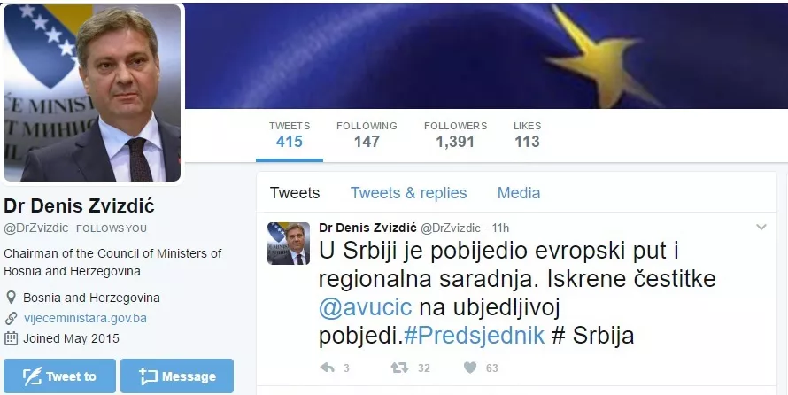 - U Srbiji je pobijedio evropski put i regionalna saradnja. Iskrene čestitke Vučiću na ubjedljivoj pobjedi - napisao je Zvizdić na Twitteru.
