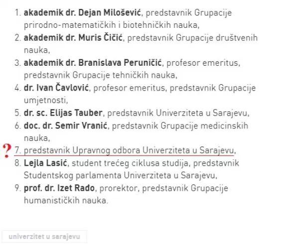 Pola godine kasnije, na prijedlog Upravnog odbora Univerziteta, Senat, kojim predsjedava rektor Škrijelj donosi odluku kojom za člana Savjeta za nauku imenuje – Sebiju Izetbegović. Osim supruge predsjednika SDA u Savjet ulaze profesori Dejan Milošević, Muris Čičić, Branislava Peruničić, Elijas Tauber, Ivan Čavlović, Semir Vranić, Izet Rađo, te studentica Lejla Lasić. Imena svih članova Savjeta za nauku objavljena su na službenoj stranici. Odnosno, skoro svih. Jer samo pod rednim brojem sedam nije navedeno ime i prezime člana Savjeta. A baš pod tim rednim brojem imenovana je profesorica, doktorica i direktorica Sebija Izetbegović.