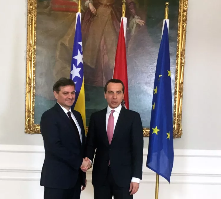 Predsjedavajući Vijeća ministara BiH Denis Zvizdić, u okviru radne posjete Austriji, sastao se danas u Beču sa saveznim kancelarom Kristianom Kernom. Razgovarali su o međusobnim odnosima dvije zemlje, aktuelnoj situaciji u EU i o ostvarivanju ciljeva koje BiH ima na putu ka Evropskoj uniji, prenosi Patria.