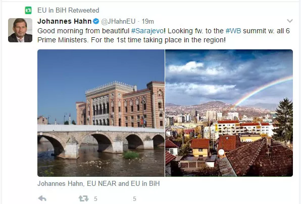 Good morning from beautiful #Sarajevo! Looking fw. to the #WB summit w. all 6 Prime Ministers. For the 1st time taking place in the region! pic.twitter.com/7y57Z30CKS