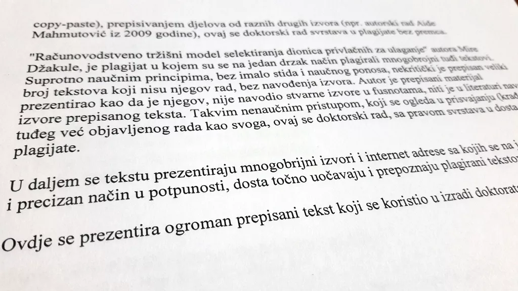 - Ovaj je rad po svom sadržaju najgrublji oblik ismijavanja nauci i naučnom stvaralaštvu. Prepisivanjem ogromnog dijela teksta, pogotovo od Centralne banke BiH - edukativni materijal, prepisivanjem dijelova iz raznih seminarskih i diplomskih radova sa interneta itd., prepisivanjem dijelova od raznih drugih izvora (npr. autorski rad Aide Mahmutović iz 2009. godine), ovaj se doktorski rad svrstava u plagijate bez premca – stoji dalje u prijavi.