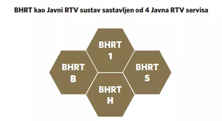 Prvo komponenata je BHRT 1 — Javni servis u okviru BHRT-a sa sjedištem u Sarajevu. Program u ovom servisu bi se emitirao na jezicima sva tri konstitutivna naroda, obuhvaća programske sadržaje namijenjene najširoj publici, svim javnostima i svim građanima u Bosni Hercegovini, uključuje programe od općeg značaja za sve građane u zemlji (Olimpijske igre, svjetska i europska prvenstva u različitim sportovima, sportske, zabavne i kulturne manifestacije međunarodnog značaja). BHRT B — Javni RTV servis sa sjedištem u Sarajevu program bi se emitirao u pravilu na bosanskom jeziku i s programskim sadržajima koji afirmativno konotiraju i reproduciraju društveni, nacionalni i kulturni identitet Bošnjaka u BiH. BHRT S imao bi sjedište u Banja Luci, emitirao bi program na srpskom jeziku i afirmirao društveni, nacionalni i kulturni identitet Srba u BiH, dok bi BHRT H imao sjedište u Mostaru i program emitovao na hrvatskom jeziku. Ostavljena je mogućnost saradnje između ova četiri servisa, ali i između ovih servisa i servisa drugih zemalja.