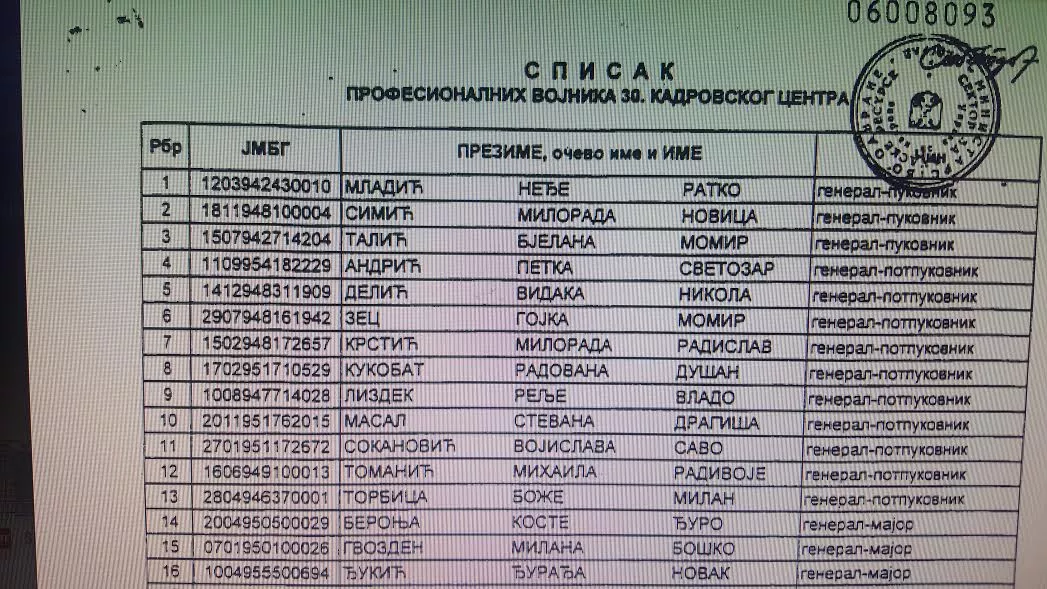 The list of 1841 members of the 30th personnel center paid by Serbia then headed by Vojislav Kostunica, also included The Hague convict, Ratko Mladic, general Momir Talic indicted in 1999 by The Hague prosecutors for crimes in BiH (deceased in 2003), Radislav Krsic sentenced to 35 years in prison for Srebrenica genocide, Novak Djukic sentenced to 20 years for the crime in Tuzla...