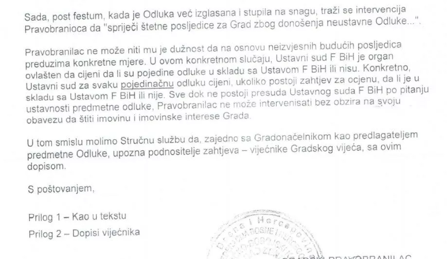 -Sada, kada je Odluka već izglasana i stupila na snagu, traži se intervencija pravobranioca da „spriječi štetne posljedice po Grad zbog donošenja neustavne Odluke...“