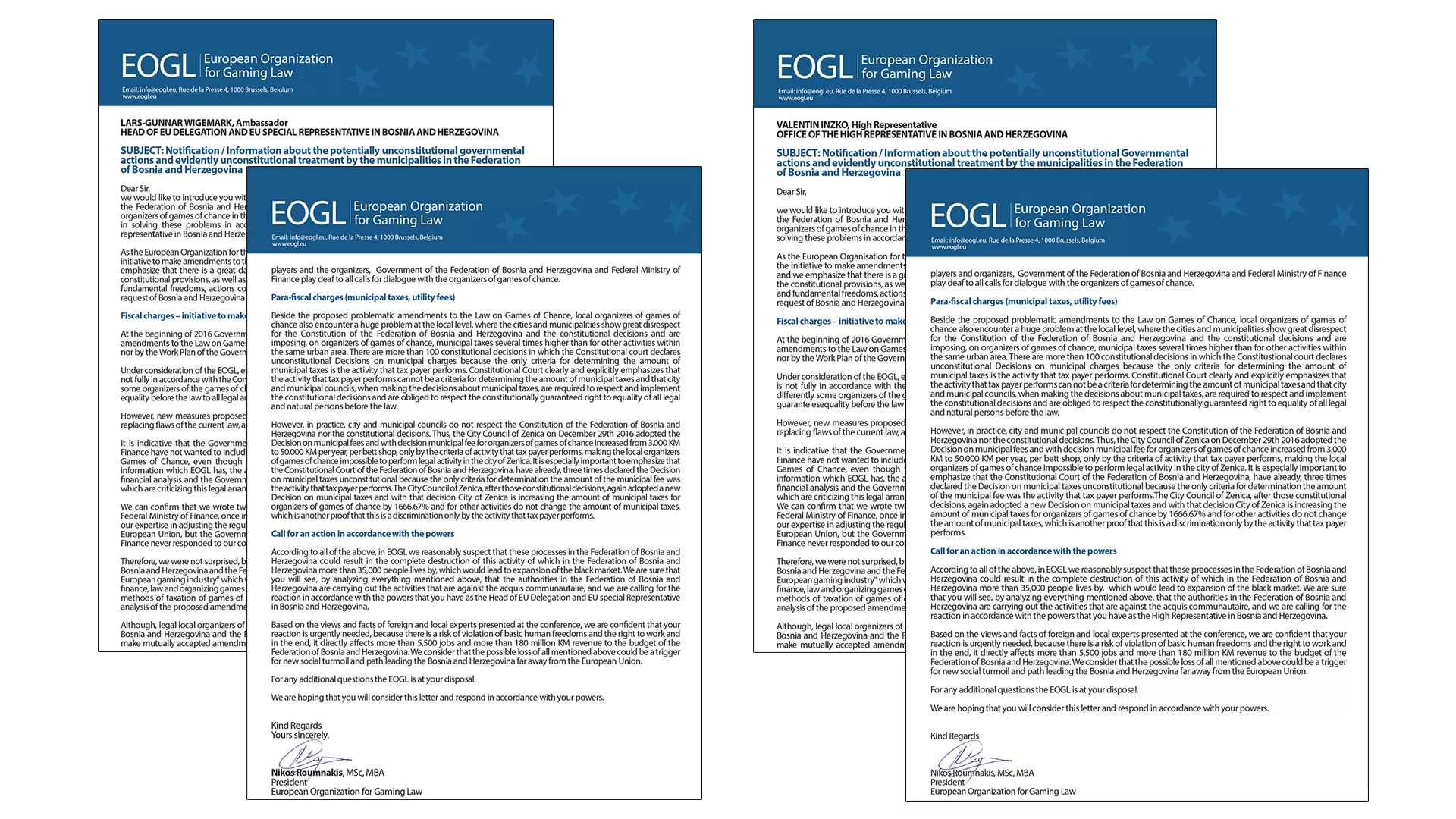 - Mi inicijativu za izmjenu Zakona o igrama na sreću u FBiH promatramo od samog početka te ističemo da postoji velika opasnost da je u pitanju ozbiljno narušavanje ravnopravnog tržišnog natjecanja, kršenje odredbi Ustava FBiH, kao i kršenje Evropske konvencije o zaštiti ljudskih prava i osnovnih sloboda te djelovanje protivno pravnim stečevinama Evropske unije, koja je 20.09.2016. prihvatila zahtjev BiH za članstvo - stoji u početku dopisa kojeg su iz EOGL-a uputili Wigemarku i Inzku.