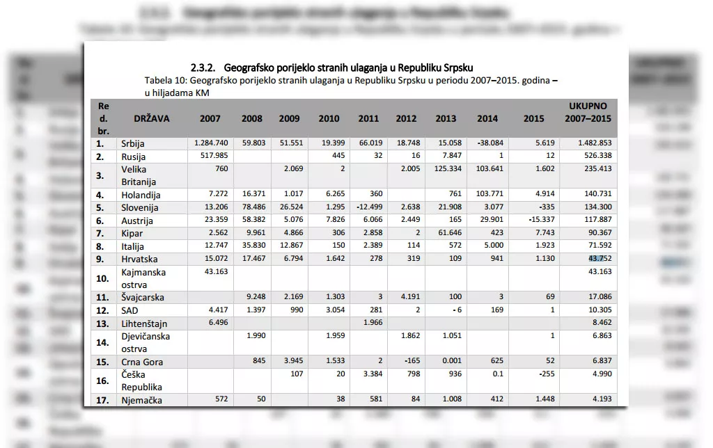 Ništa bolja situacija nije ni sa investicijama. Strane investicije u RS godinama unazad su u padu, a u 2015. iz SAD-a je u RS stiglo svega 1.000 KM. iz SAD.a u RS je od 2007. do 2015. godine stiglo 10,3 miliona KM investicija, prenosi NAP.