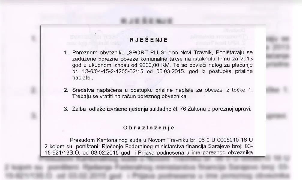 Kantonalni sud u Novom Travniku naložio je općini Bugojno da sportskim kladionicama „Sport plus“ mora vratiti 9.000 KM, plus kamate, koje je Općina od kladionica naplatila 2013. godine, po osnovu komunalnih taksi, a za koje je Ustavni sud FBiH sada ocijenio da su protivne Ustavu Federacije BiH, piše Patria.