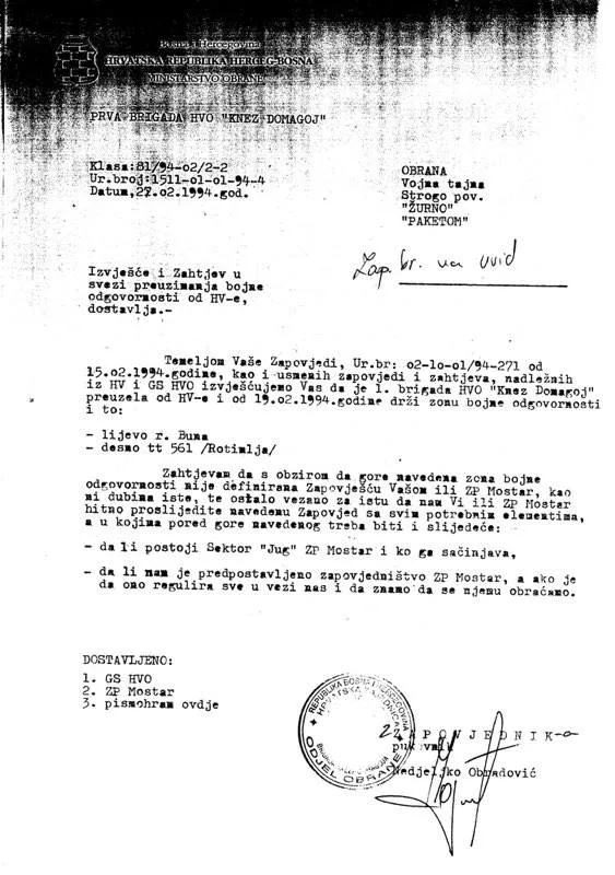 Izvještaj o preuzimanju bojne odgovornosti od Hrvatske vojske koje prema MO HRHB podnosi pukovnik Nedeljko Obradović komandant 1. Brigade HVO Knez Domagoj, dokazuje prisustvo hrvatskih regularnih vojnih snaga na teritoriji BiH i direktnu vojnu saradnju sa jedinicama HVO-a u ratnim djelovanjima protiv Armije R BiH kao jedine regularne vojne formacije u BiH.
