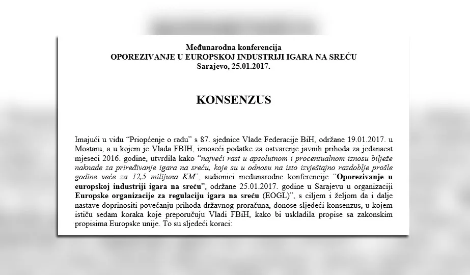 - Budući da je konferencija održana za vrijeme trajanja javne rasprave oko izrade Prijedloga Zakona o izmjenama i dopunama Zakona o igrama na sreću koji je već mjesecima predmet rasprava u Vladi Federacije Bosne i Hercegovine i oba doma Parlamenta Federacije Bosne i Hercegovine, smatramo kako su Vlada Federacije Bosne i Hercegovine i Federalno ministarstvo financija svojim nedolaskom dokazali kako ne uvažavaju mišljenja, stavove i iskustva zemalja Evropske unije i struke te izražavamo svoju zabrinutost zbog ovakvog krajnje neodgovornog pristupa izradi prijedloga zakona o kojem ovisi budućnost 5.500 radnika i 2.600 vlasnika prostora, kao i 80 miliona KM direktnih godišnjih prihoda federalnog proračuna – navodi se u pismu priređivača. Pozivaju institucije da analiziraju Konsenzus kojeg su sudionici međunarodne konferencije usuglasili u Sarajevu prije nekoliko dana, prenosi NAP.