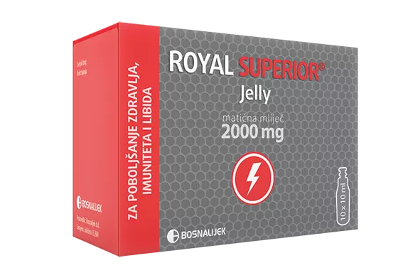 ROYAL SUPERIOR® Jelly je dodatak ishrani namijenjen za primjenu u odraslih. Jedna ampula od 10 ml sadrži 2000 mg matične mliječi s okusom jagode. Naročito je efikasan zbog svojih nutritivnih, metaboličkih i energizirajućih benefita, koji potpomažu bolje funkcioniranje tijela. ROYAL SUPERIOR® Jelly poboljšava fizičke i psihičke performanse, podiže imunitet, povećava apetit, poboljšava apsorpciju vitamina i minerala, a ima i antimikrobni efekat. Preporučuje se u bilo koje doba godine, naročito kod osoba izloženih velikim fizičkim naporima, osobama sa teškim oštećenjem imuniteta i osobama sa smanjenim libidom.