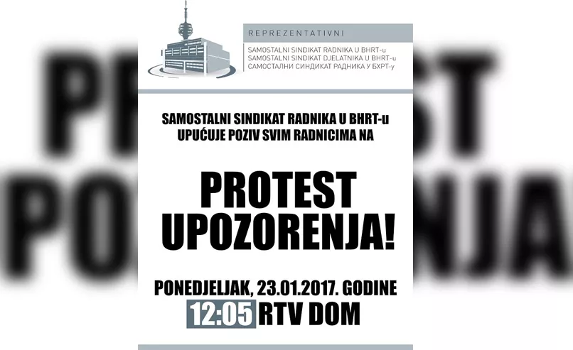 Samostalni sindikata radnika u BHRT-u organizuje protest upozorenja sutra 23. januara u zgradi RTV Doma u 12:05 uz direktan prijenos na BHT1, saopćeno je iz ove sindikalne organizacije, piše Patria.