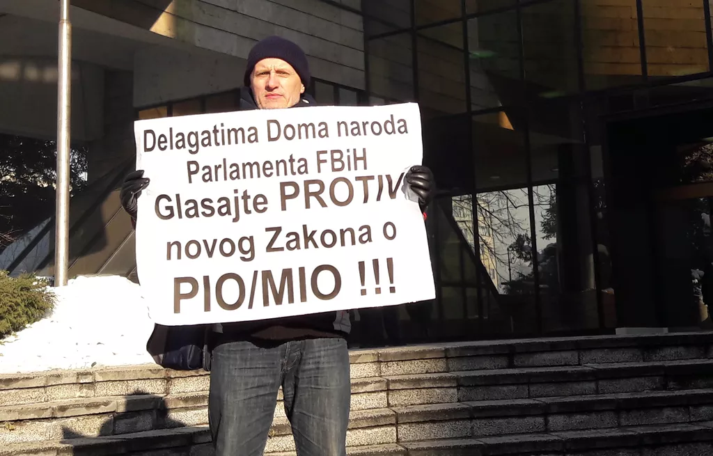Dok delegati u sali Federalnog parlamenta vode burnu raspravu o novom Zakonu, na ulazu u Parlament protestuje aktivista iz Zenice Hasan Kreho. On od delegata traži da ne usvoje predloženi Zakon o penzijskom i invalidskom osiguranju, „jer će on biti štetan za radnike u realnom sektoru“.
