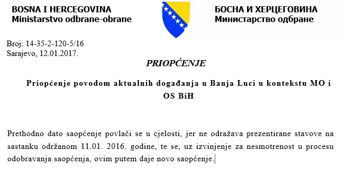 Nakon puna dva sata kada je iz Ministarstva odbrane BiH medijima upućeno saopćenje o događajima od 8. i 9. januara u kojem se navodi da nisu prekršene procedure i lanac komandovanja, iz MO BiH poslali su novo saopćenje a prethodno proglasili nevažećim!?
