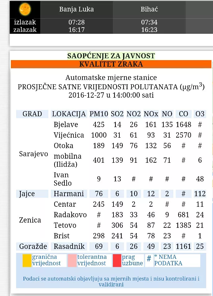 Automatska stanica – Bjelave 134 µg/m3, Vijećnica 130 µg/m3, Otoka 168 µg/m3, Ilidža 169 µg/m3).