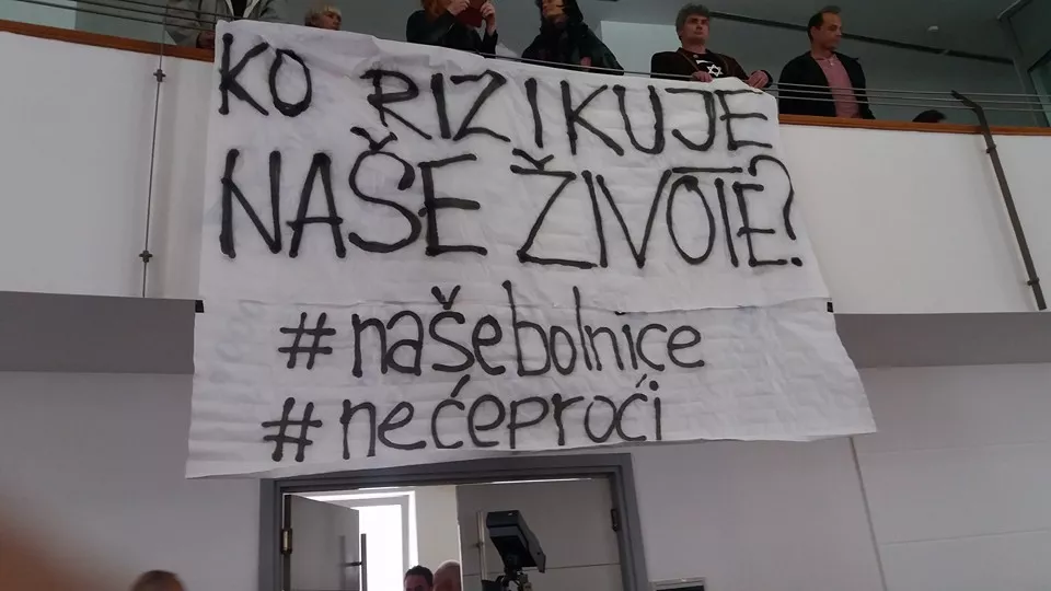 Podsjećamo istu ovu Skupštinu da su građani u maju 2016. godine braneći Opću bolnicu “Prim.dr. Abdulah Nakaš” od zatvaranja i pripajanja UKCS-u ušli na sjednicu i na galeriji raširili transparent na kojem je pisalo „Ko rizikuje naše živote? #naše bolnice# neće proći“ te u skupštinsku salu bacilli nekoliko desetina letaka na kojima upozoravaju zastupnike o zakulisnim igrama koje su se vodile oko ove bolnice. Sjednica je tada prekinuta, a transparent je poderao zastupnik SDA Fikret Prevljak. Isto tako, premijer KS Elmedin Konaković umjesto da podrži građane on je iskoristio momenat i uslikao “neposlušnike” koji prekidaju sjednicu.